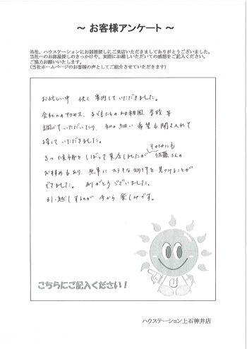 9月の転勤に際し、社宅を探しにお越しいただきました。 夏休みの最後の日を、ご家族で遠方からわざわざお土産まで持ってきていただき とても嬉しかったです^^ ご主人さまの通勤時間はもちろんですが、お子様がいらっしゃるので小学校や幼稚園の環境なども含めていろいろお部屋をご覧いただきました。 満足のいく広さのお部屋が見つかってよかったです^^担当:佐藤